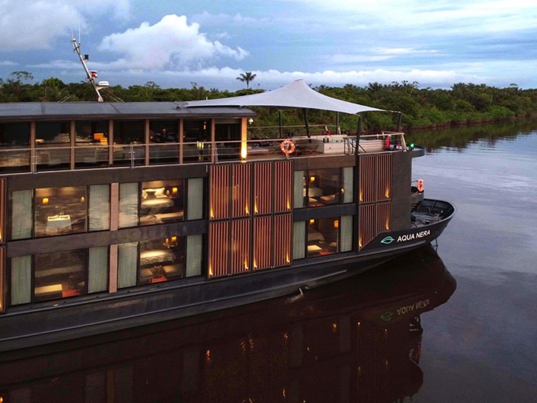 Aqua Nera is a new luxury cruise on the Amazon River. The luxury boat has 20 suites and can accommodate up to 37 travelers. The gastronomy is superb, and the naturalist guides are outstanding. The cruise takes us into the remote rainforest areas to see pink dolphins, birds, parrots, monkeys, sloths, caimans, capybaras, and, if lucky, even the mighty anaconda in their natural habitat.